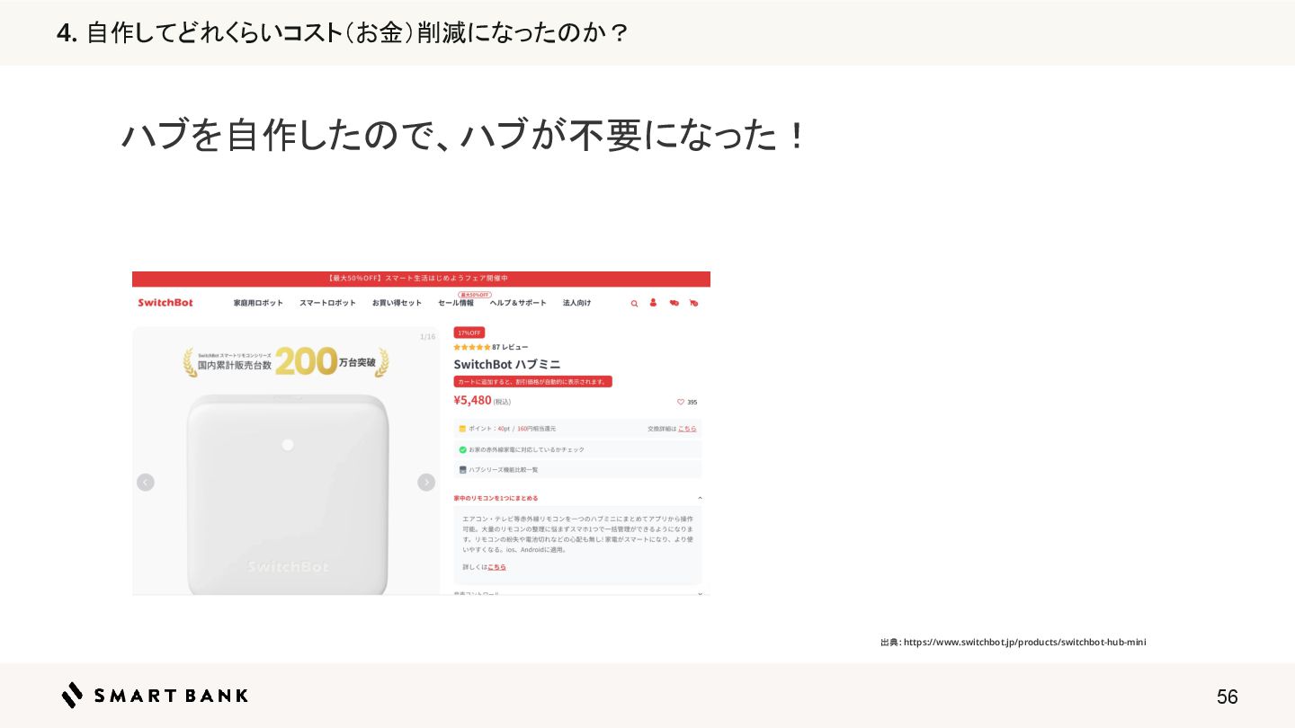 56 4. 自作してどれくらいコスト(お金)削減になったのか? ハブを自作したので、ハブが不要になった! 出典: https://www.switchbot.jp/products/switchbot-hub-mini