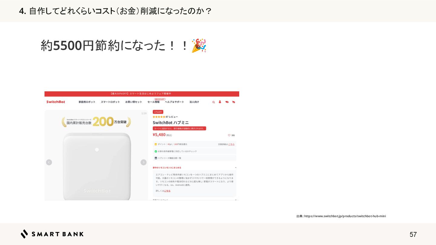 57 4. 自作してどれくらいコスト(お金)削減になったのか? 約5500円節約になった!!🎉 出典: https://www.switchbot.jp/products/switchbot-hub-mini