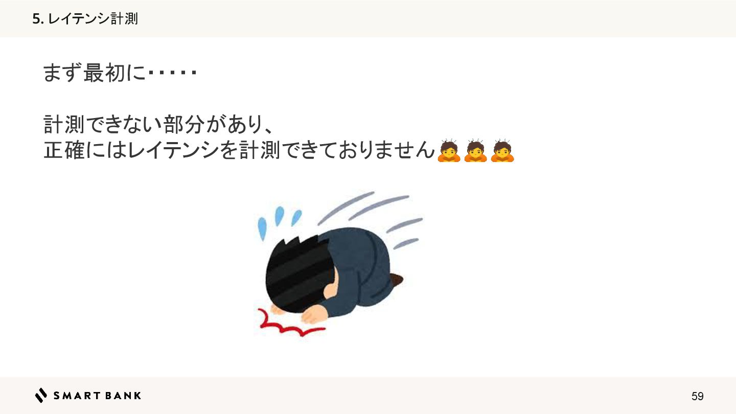 59 5. レイテンシ計測 まず最初に・・・・・ 計測できない部分があり、 正確にはレイテンシを計測できておりません🙇🙇🙇