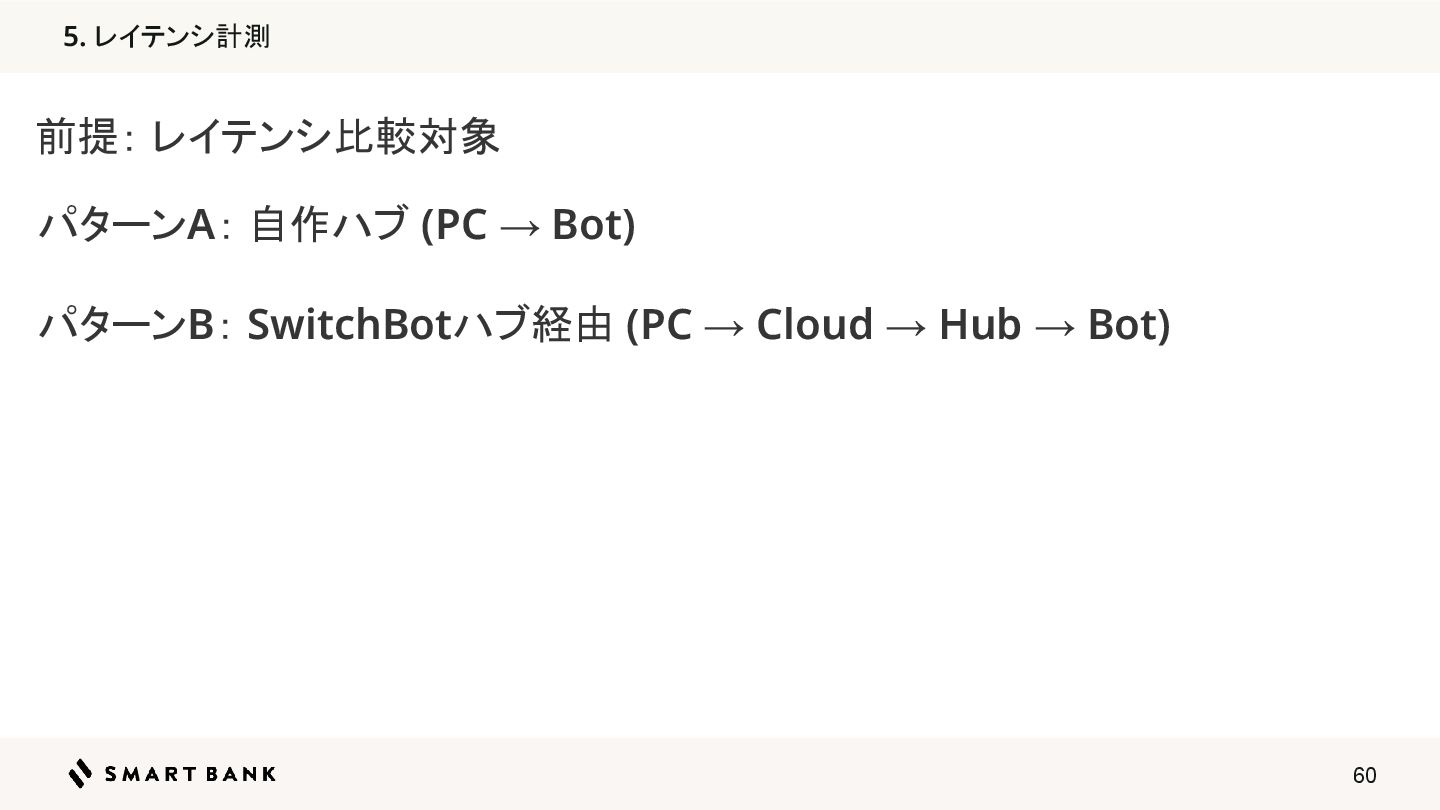 60 5. レイテンシ計測 前提: レイテンシ比較対象 パターンA: 自作ハブ (PC → Bot)