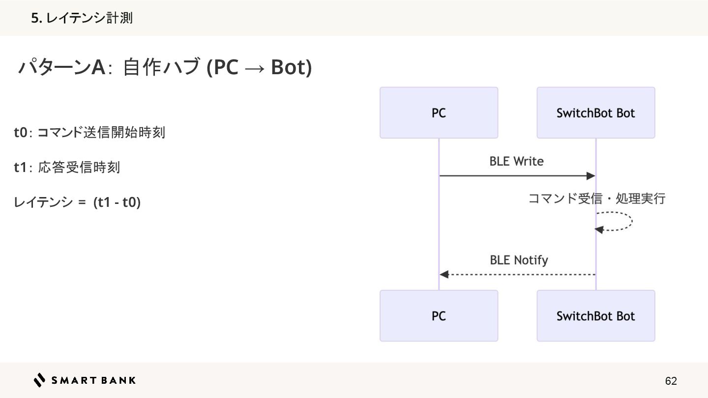 → Bot) t0: HTTPリクエスト送信開始時刻 t1: HTTPレスポンス受信時刻 レイテンシ = (t1 - t0) + (BLE latency) ※ BLE latencyはパターンAで算出したものを代入する (この場合、BLE latencyを計測するのは困難なため) ※ CloudとHubの間の時間も計測不可能なため無視する ここに要した時間は無視