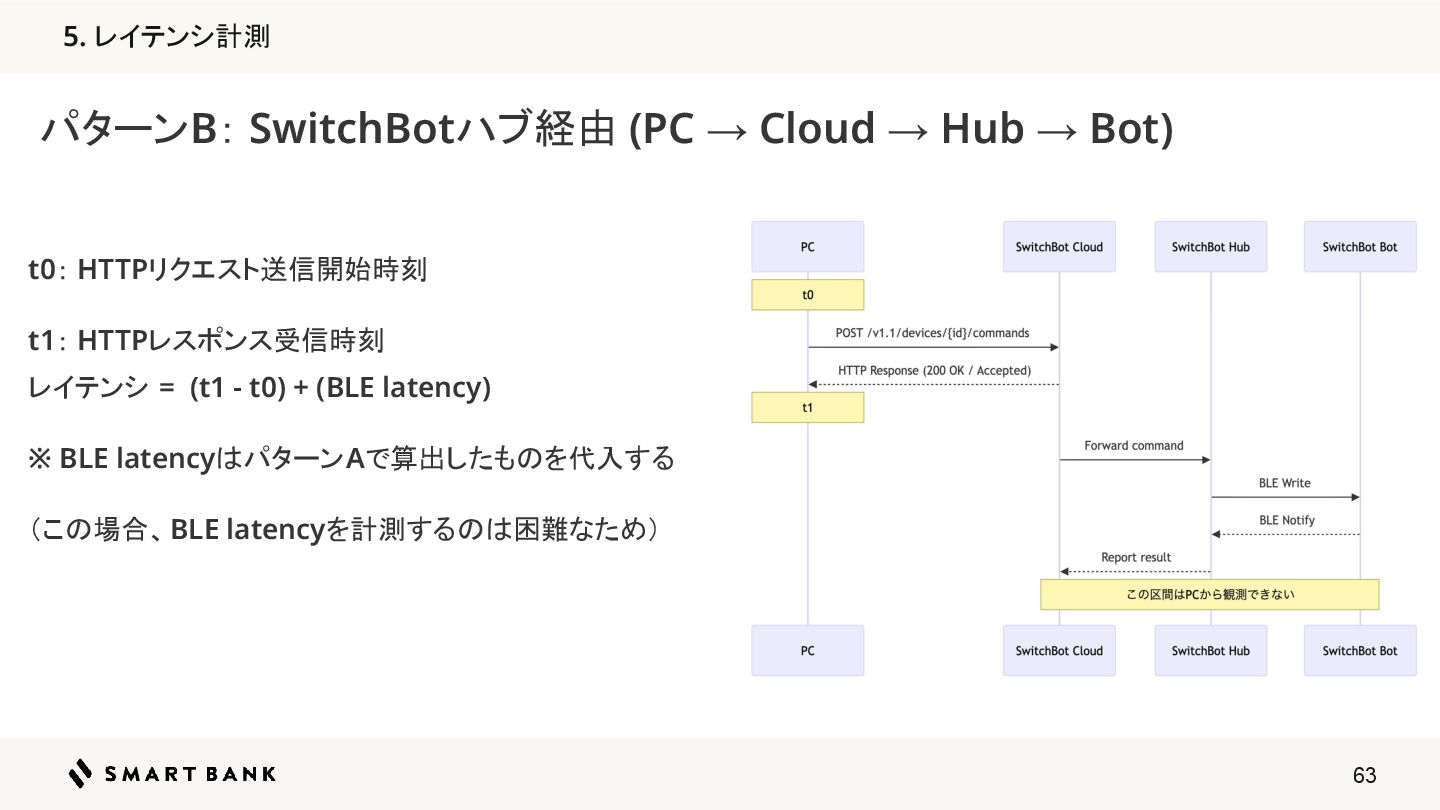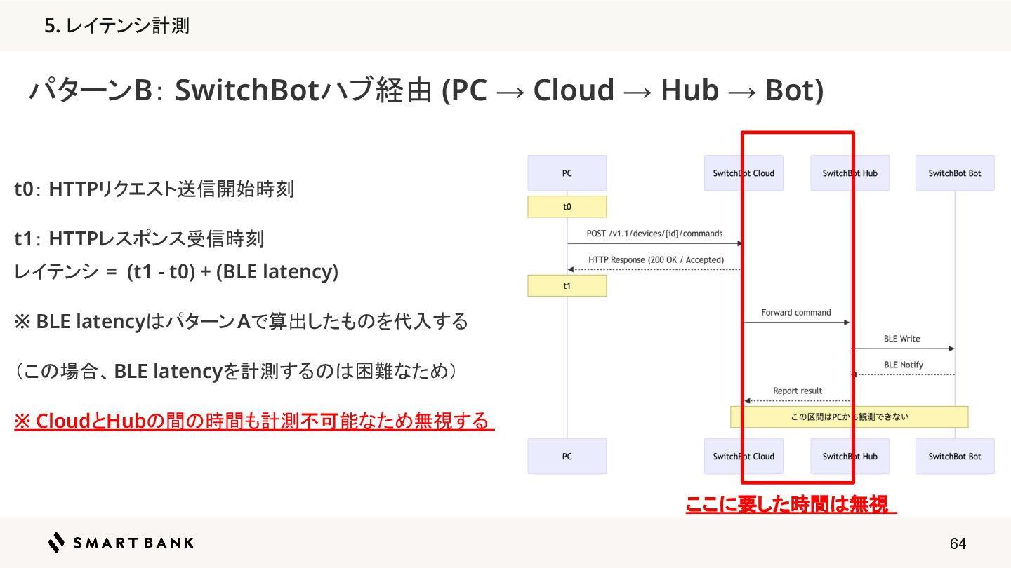 63 5. レイテンシ計測 パターンB: SwitchBotハブ経由 (PC → Cloud → Hub