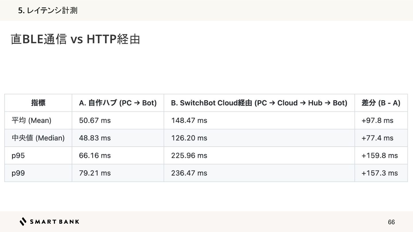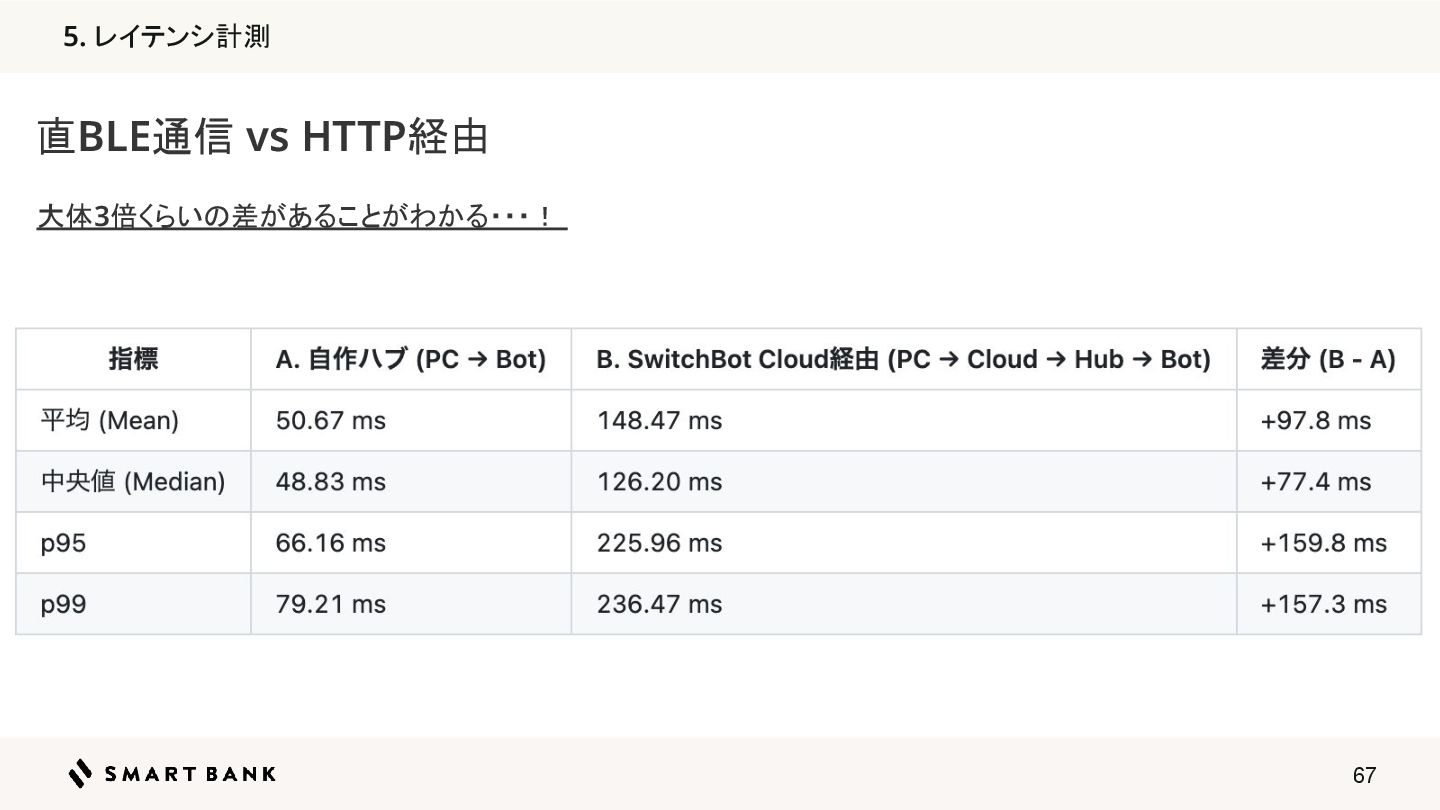 66 5. レイテンシ計測 直BLE通信 vs HTTP経由