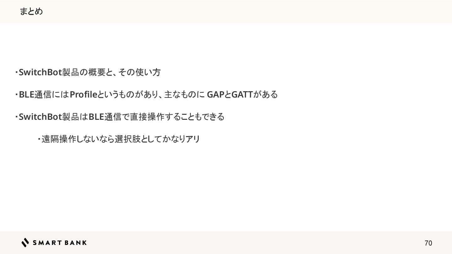70 まとめ ・SwitchBot製品の概要と、その使い方 ・BLE通信にはProfileというものがあり、主なものに GAPとGATTがある ・SwitchBot製品はBLE通信で直接操作することもできる ・遠隔操作しないなら選択肢としてかなりアリ