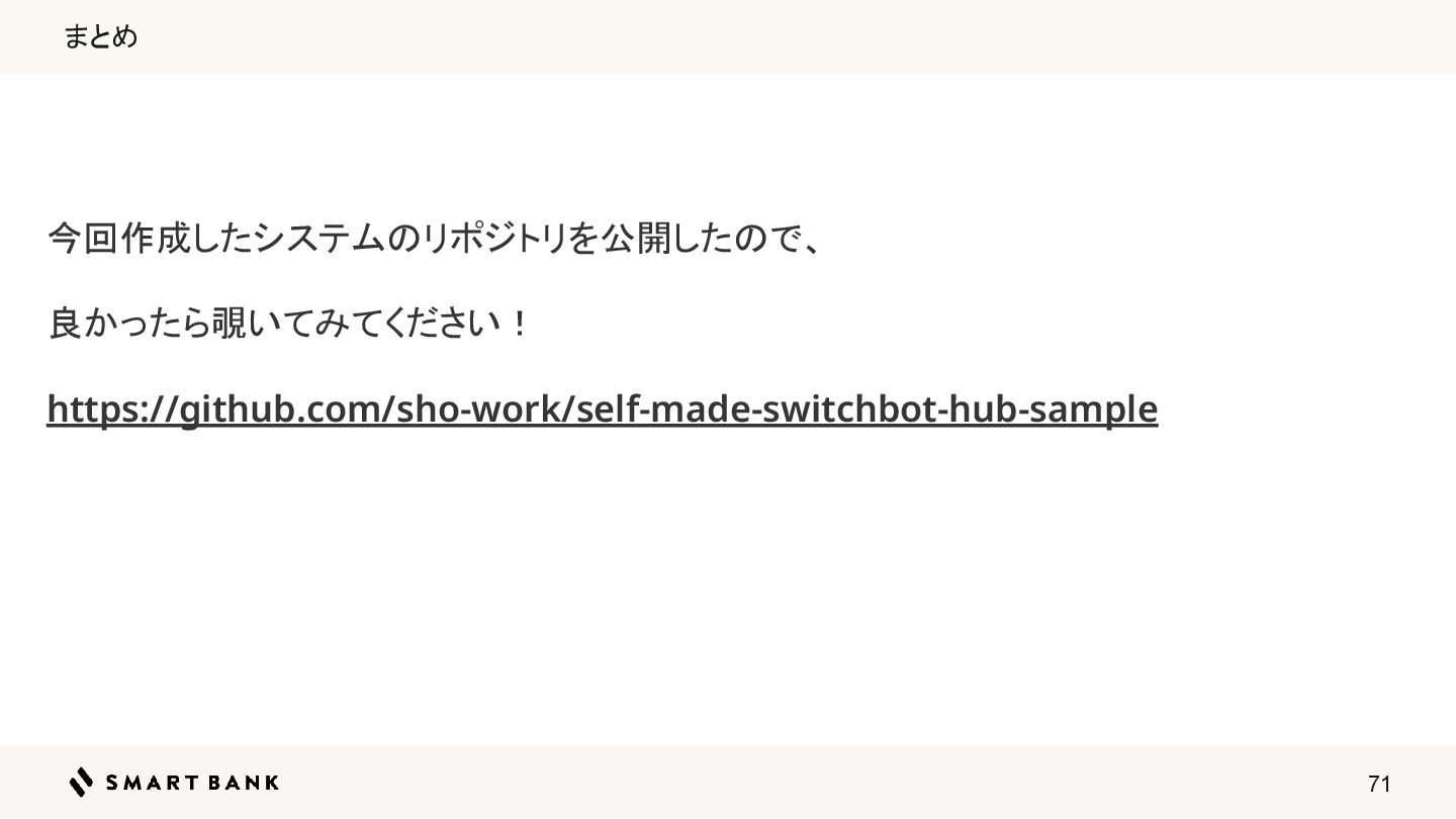 71 まとめ 今回作成したシステムのリポジトリを公開したので、 良かったら覗いてみてください! https://github.com/sho-work/self-made-switchbot-hub-sample