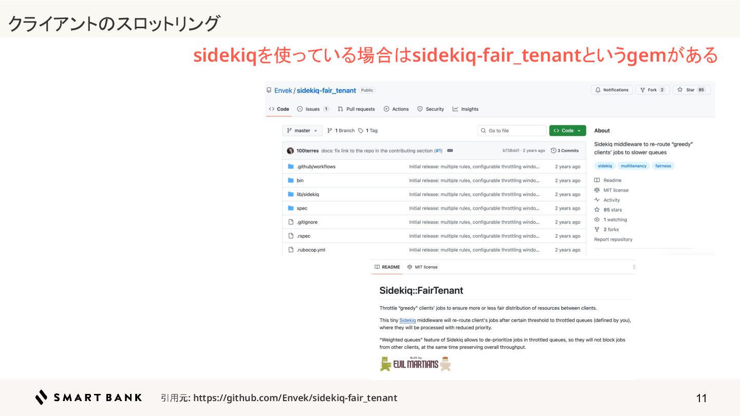 11 引用元: https://github.com/Envek/sidekiq-fair_tenant sidekiqを使っている場合はsidekiq-fair_tenantというgemがある ク ライアントのスロットリング