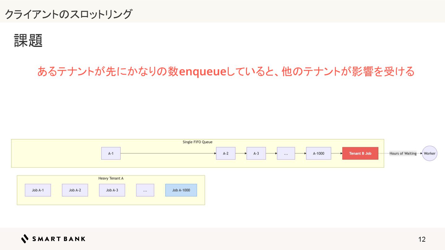 12 あるテナントが先にかなりの数enqueueしていると、他のテナントが影響を受ける ク ライアントのスロットリング 課題
