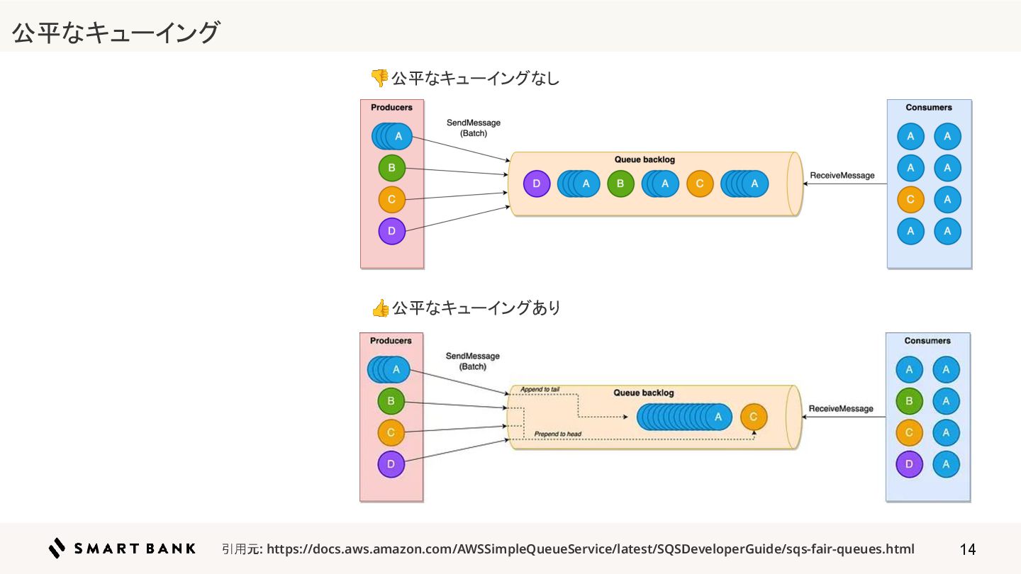 14 👎公平なキューイングなし 👍公平なキューイングあり 引用元: https://docs.aws.amazon.com/AWSSimpleQueueService/latest/SQSDeveloperGuide/sqs-fair-queues.html 公平なキューイング