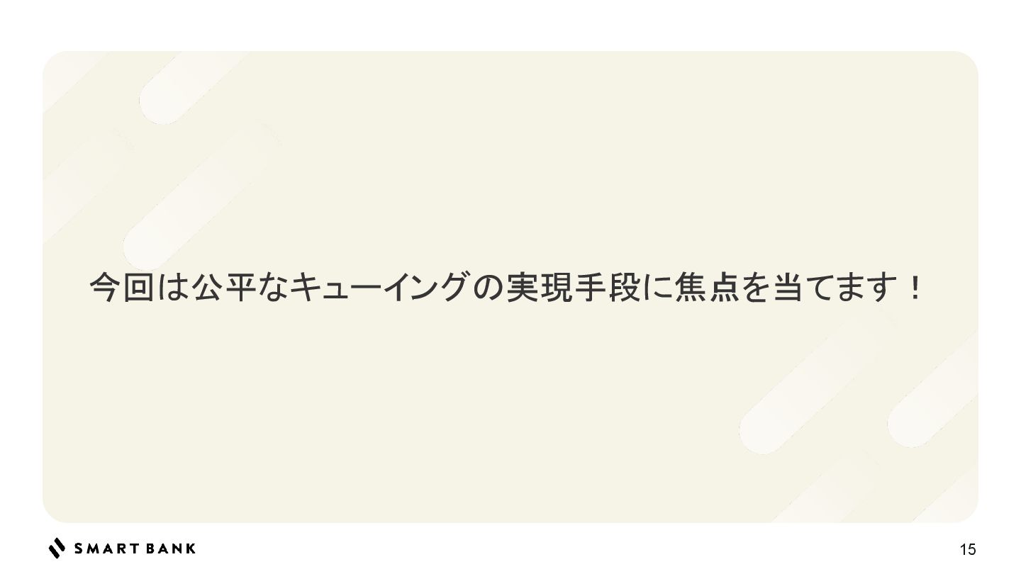 15 今回は公平なキューイングの実現手段に焦点を当てます!