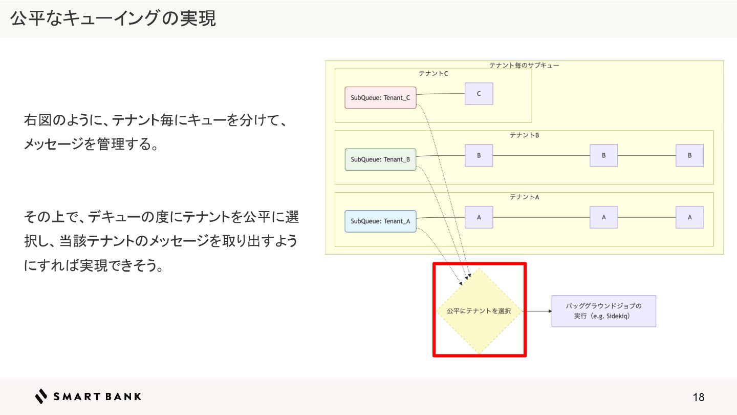 17 右図のように、テナント毎にキューを分けて、 メッセージを管理する。 その上で、デキューの度にテナントを公平に選 択し、当該テナントのメッセージを取り出すよう にすれば実現できそう。 公平なキューイングの実現