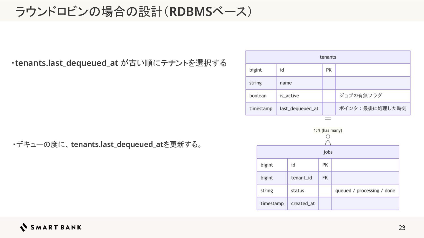 23 ・tenants.last_dequeued_at が古い順にテナントを選択する ・デキューの度に、