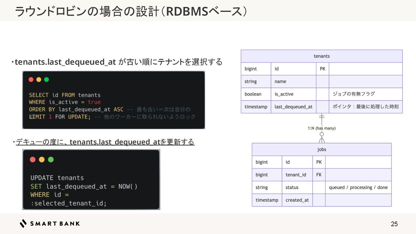 25 ・tenants.last_dequeued_at が古い順にテナントを選択する ・デキューの度に、tenants.last_dequeued_atを更新する