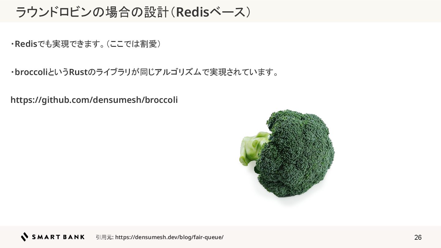 26 ・Redisでも実現できます。(ここでは割愛) ・broccoliというRustのライブラリが同じアルゴリズムで実現されています。 https://github.com/densumesh/broccoli ラウンドロビンの場合の設計(Redisベース)