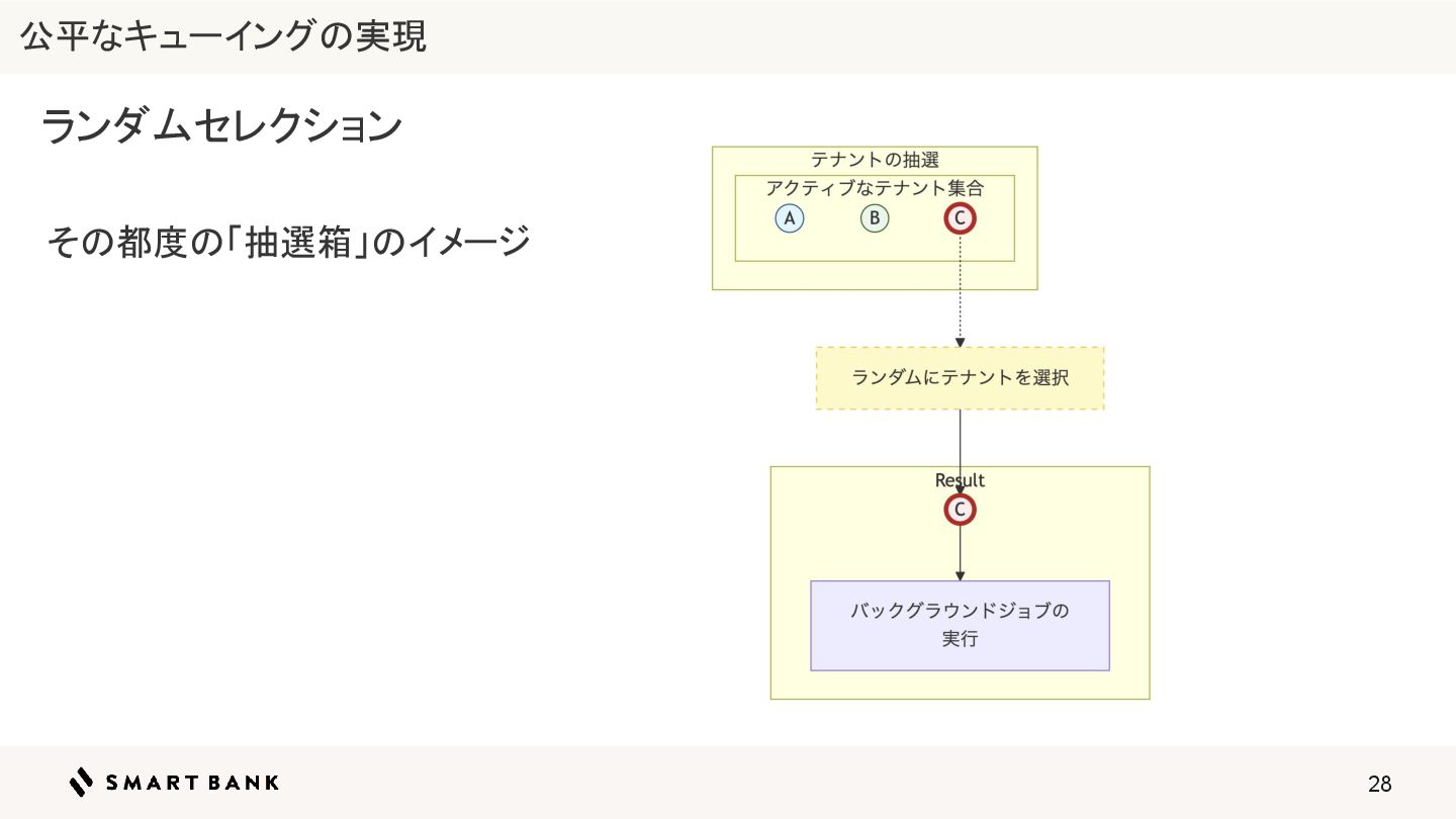 28 ランダムセレクション その都度の「抽選箱」のイメージ 公平なキューイングの実現