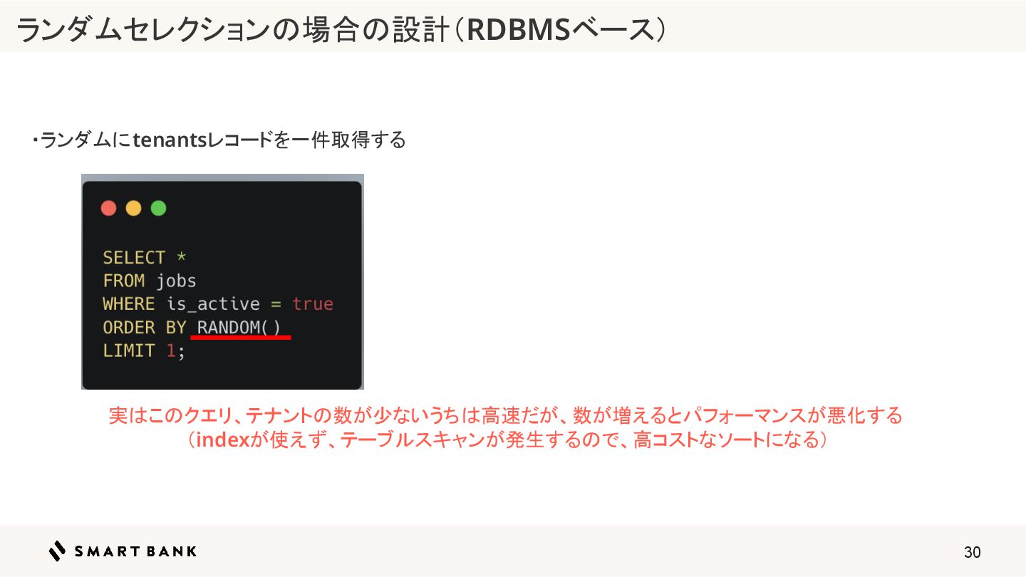 29 ・ランダムにtenantsレコードを一件取得する ランダムセレクションの場合の設計(RDBMSベース)