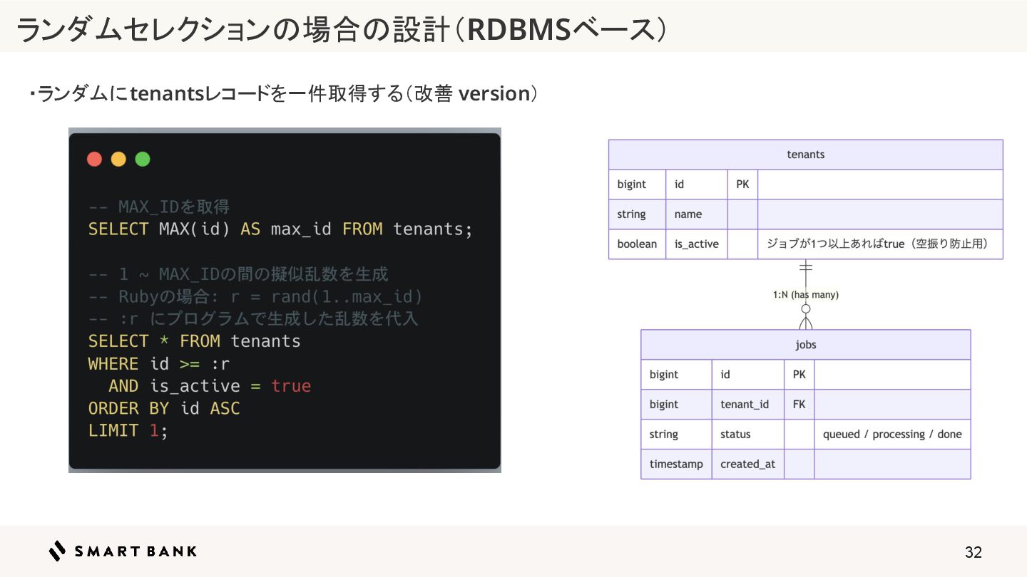 32 ・ランダムにtenantsレコードを一件取得する(改善 version) ランダムセレクションの場合の設計(RDBMSベース)