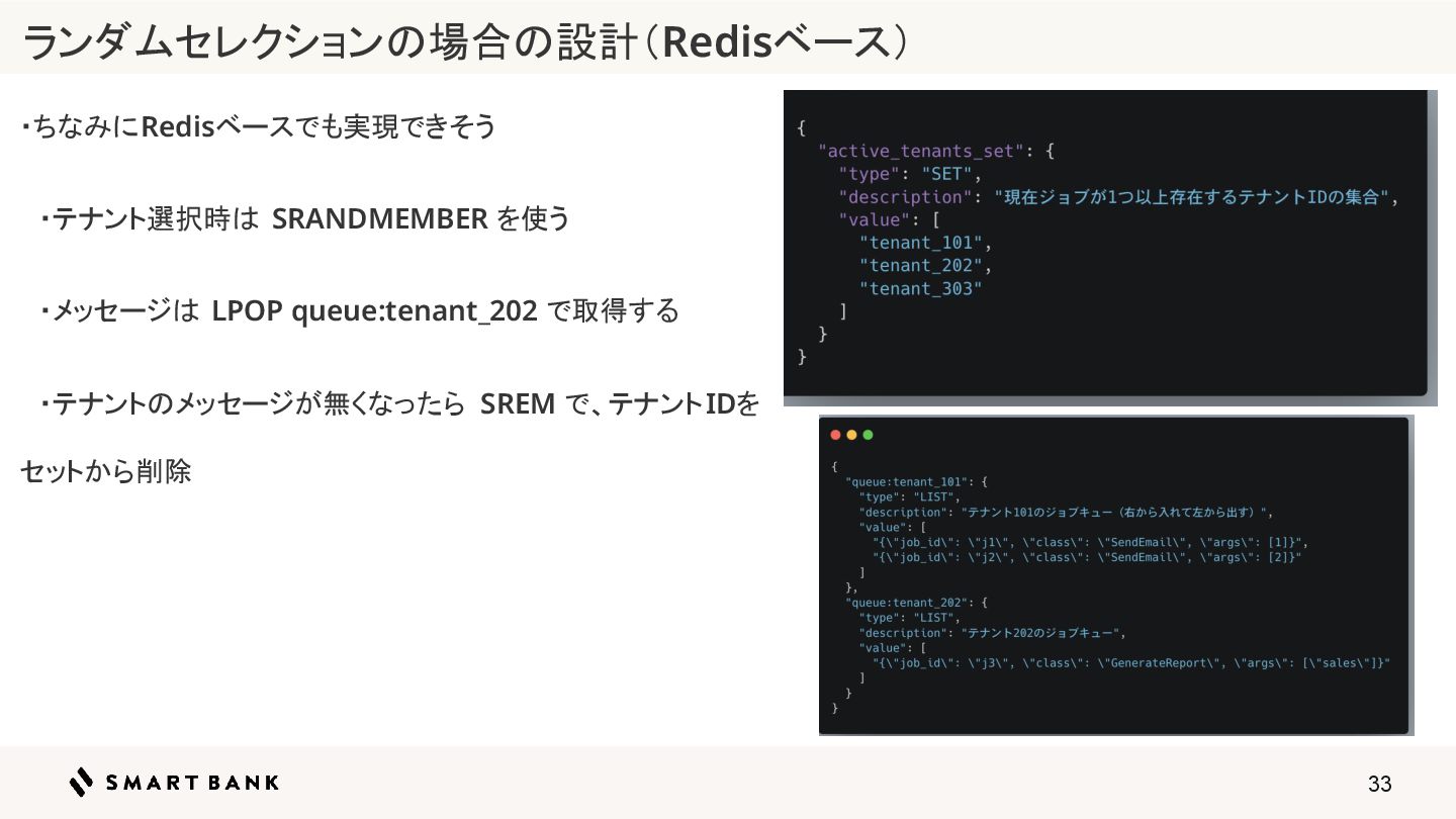 33 ランダムセレクションの場合の設計(Redisベース) ・ちなみにRedisベースでも実現できそう ・テナント選択時は SRANDMEMBER を使う ・メッセージは LPOP queue:tenant_202