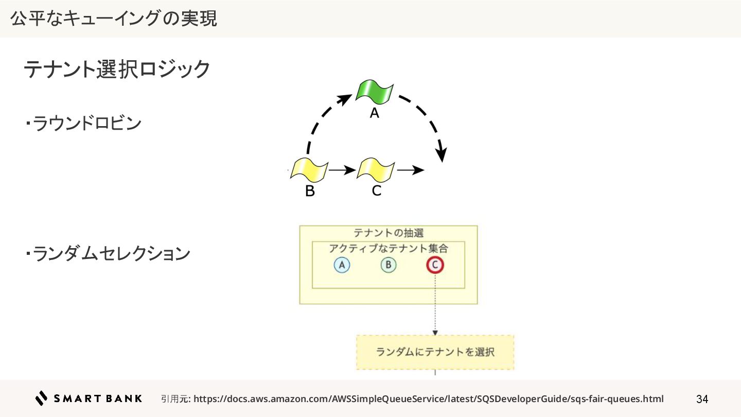 34 テナント選択ロジック ・ラウンドロビン ・ランダムセレクション 引用元: https://docs.aws.amazon.com/AWSSimpleQueueService/latest/SQSDeveloperGuide/sqs-fair-queues.html 公平なキューイングの実現