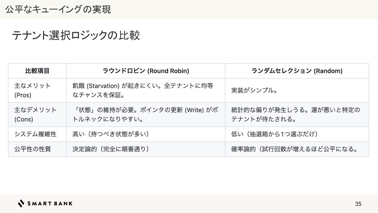 35 テナント選択ロジックの比較 公平なキューイングの実現