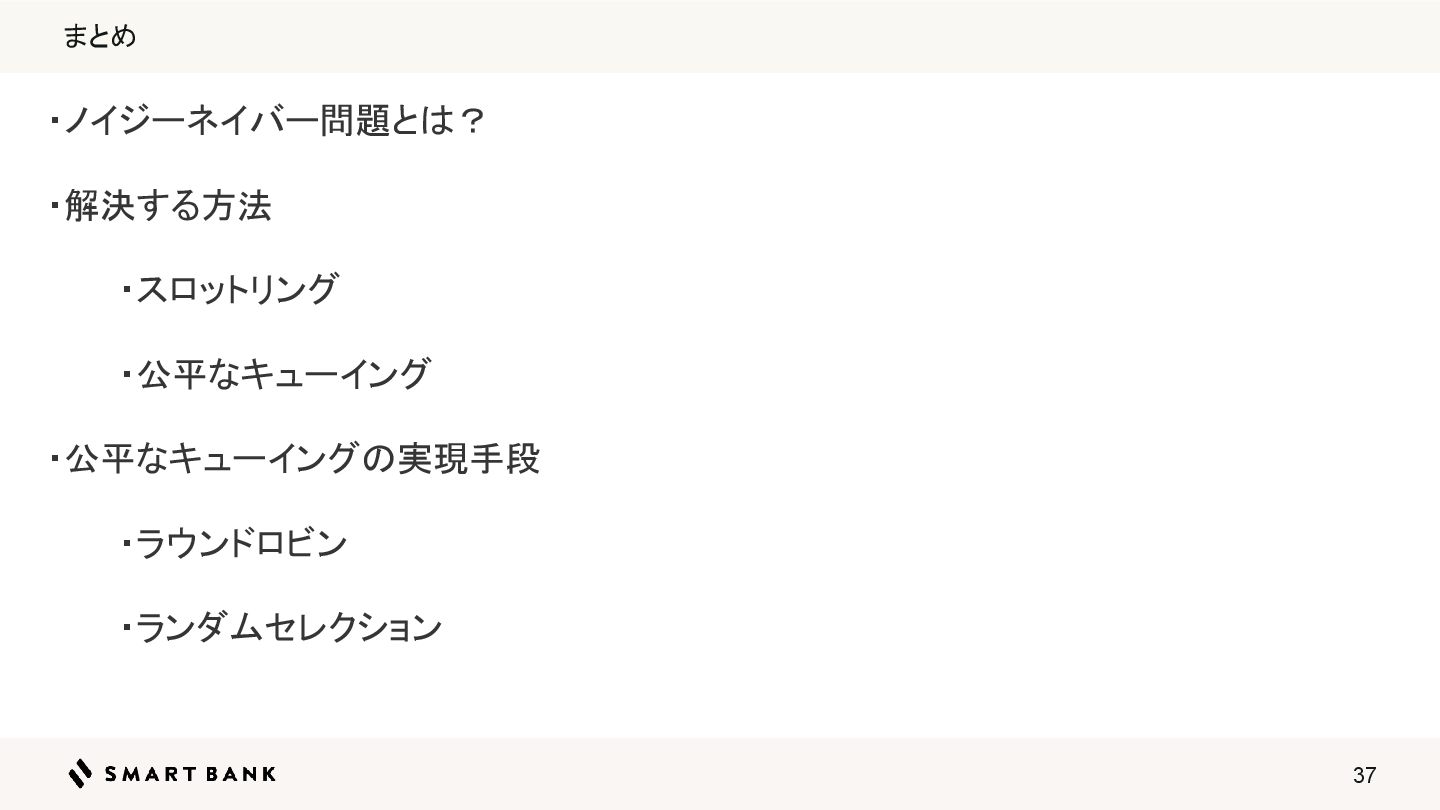 37 まとめ ・ノイジーネイバー問題とは? ・解決する方法 ・スロットリング ・公平なキューイング ・公平なキューイングの実現手段 ・ラウンドロビン ・ランダムセレクション