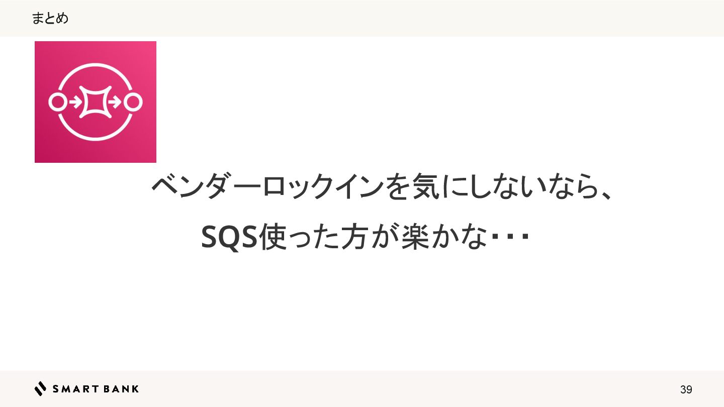 39 まとめ ベンダーロックインを気にしないなら、 SQS使った方が楽かな・・・