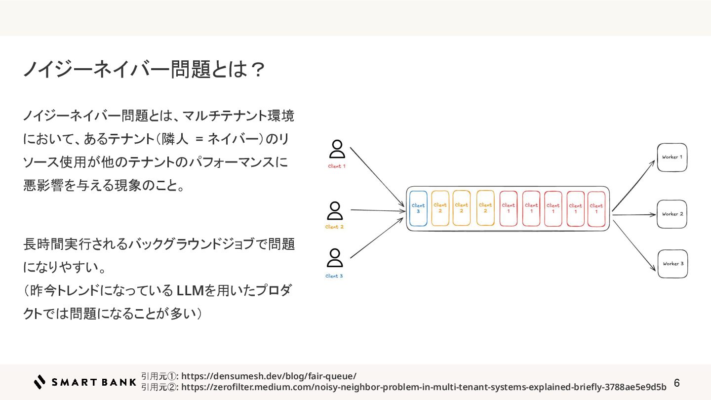 長時間実行されるバックグラウンドジョブで問題 になりやすい。 (昨今トレンドになっている LLMを用いたプロダ クトでは問題になることが多い) 引用元①: https://densumesh.dev/blog/fair-queue/ 引用元②: https://zerofilter.medium.com/noisy-neighbor-problem-in-multi-tenant-systems-explained-briefly-3788ae5e9d5b