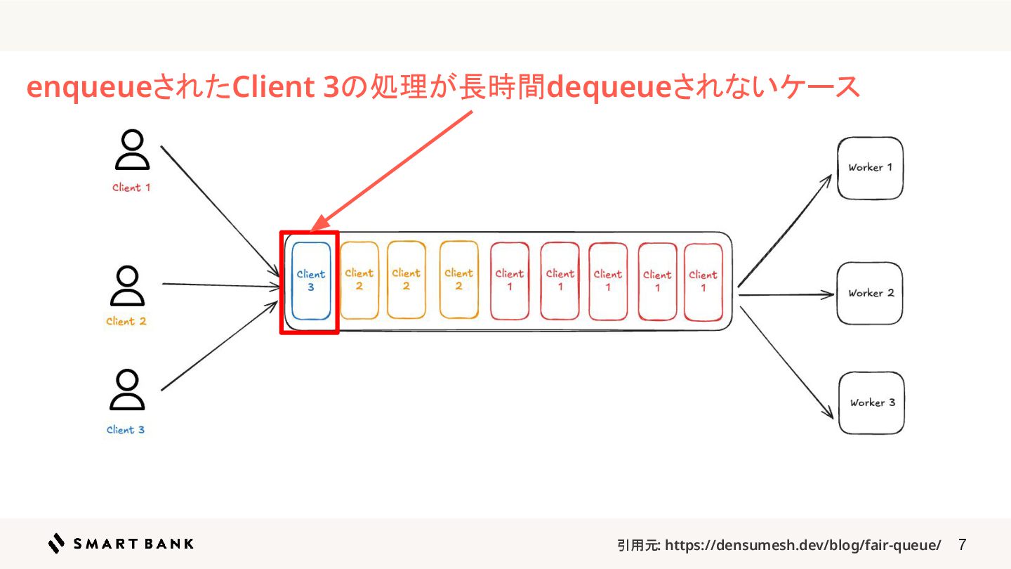 7 引用元: https://densumesh.dev/blog/fair-queue/ enqueueされたClient 3の処理が長時間dequeueされないケース