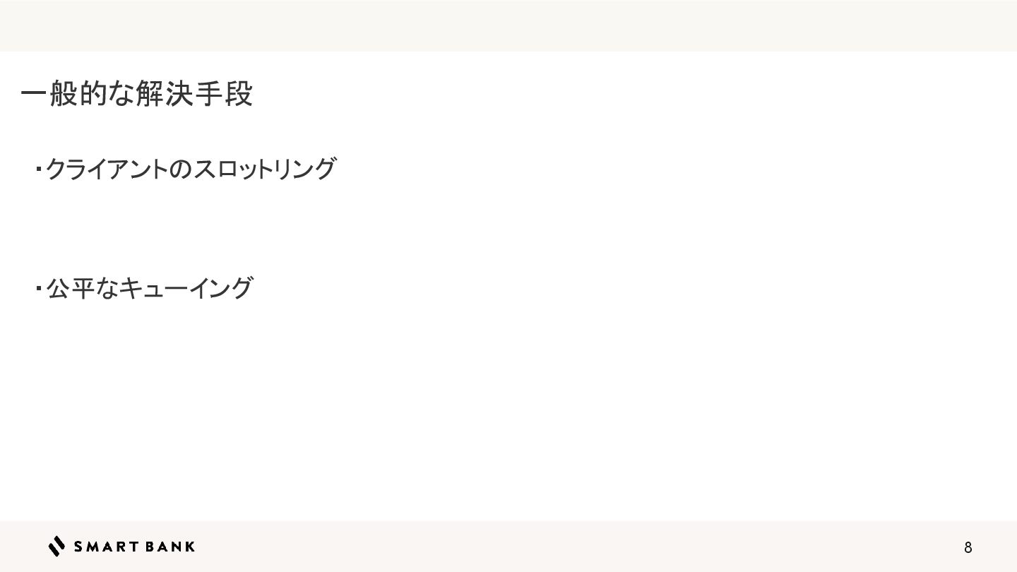 8 一般的な解決手段 ・ク ライアントのスロットリング ・公平なキューイング