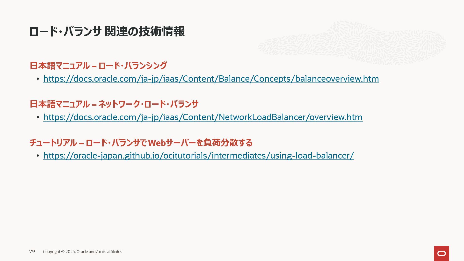 Oracle Cloud Infrastructure (OCI) の技術説明資料、ロード・バランサ 詳細 - フレキシブル・ロード・バランサ(FLB) (Level 200) です。 OCI ロード・バランサ・サービス(FLB)について、セッション永続性、仮想ホストによるルーティング、URIパス・ベース・ルーティング、SSLの利用とSSLターミネーションの設定、ロードバランサー で取得できるメトリック、トラブル時の対応ガイドラインなどの応用的な利用方法について解説しています。