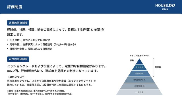 能⼒に合わせて⽬標設定 • 売却件数 ... 在庫状況によって⽬標設定(⼊社1〜2年後から) • ⽬標粗利⾦額 ... 役職に応じて⽬標設定 ミッショングレードおよび役職によって、定性的な⽬標設定があります。 年に2回、評価⾯談があり、達成度を⾒極める制度になっています。 【昇格について】 昇格基準をクリアし、上⻑からの推薦があり役割定義(ミッショングレード)を 満たしていると、事業部⻑並びに役員が判断した場合に昇格するものとする。 ※昇格‧降格の売却粗利には、本⼈に帰属するすべての売上を含む。 (仲介⼿数料、建築粗利、紹介料等を含み、按分がある場合は按分後の売上) 専任部⻑ 店⻑/課⻑ 専任課⻑/係⻑ 主任/副主任 ⼀般社員 キャリア階層イメージ 管理職 部⻑ 定性的評価制度
