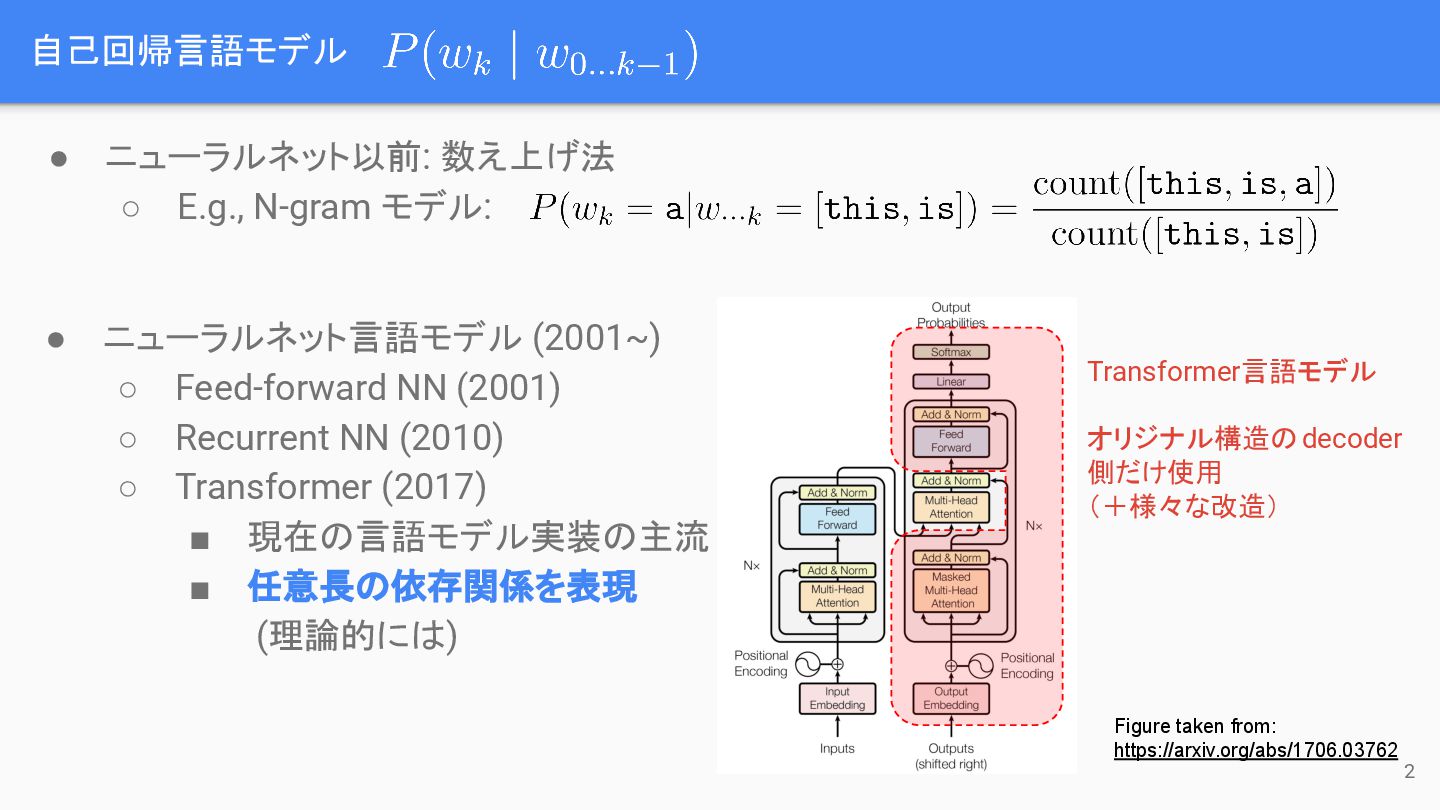 (2001~) ◦ Feed-forward NN (2001) ◦ Recurrent NN (2010) ◦ Transformer (2017) ▪ 現在の言語モデル実装の主流 ▪ 任意長の依存関係を表現 (理論的には) Figure taken from: https://arxiv.org/abs/1706.03762 Transformer言語モデル オリジナル構造のdecoder 側だけ使用 (+様々な改造) 2