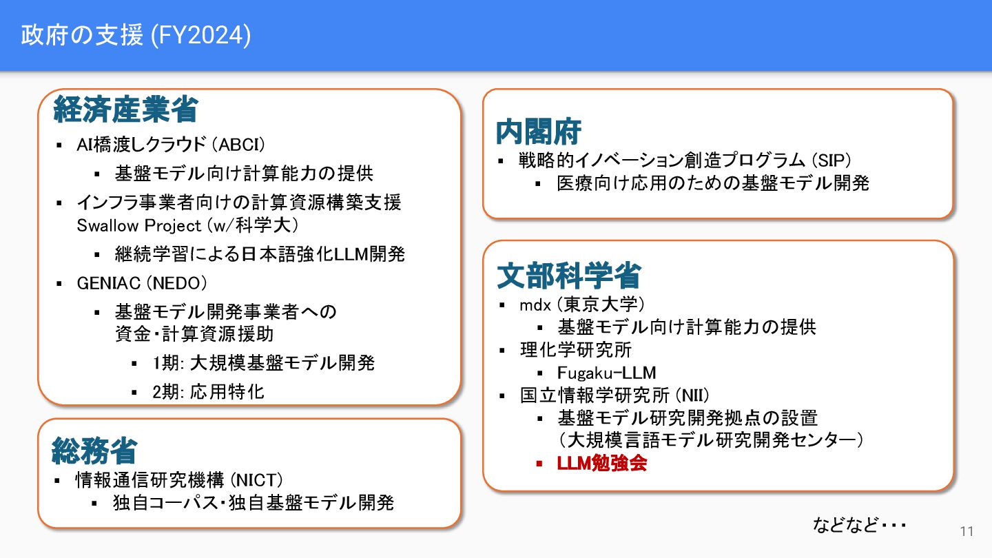 ▪ インフラ事業者向けの計算資源構築支援 Swallow Project (w/科学大) ▪ 継続学習による日本語強化LLM開発 ▪ GENIAC (NEDO) ▪ 基盤モデル開発事業者への 資金・計算資源援助 ▪ 1期: 大規模基盤モデル開発 ▪ 2期: 応用特化 内閣府 ▪ 戦略的イノベーション創造プログラム (SIP) ▪ 医療向け応用のための基盤モデル開発 総務省 ▪ 情報通信研究機構 (NICT) ▪ 独自コーパス・独自基盤モデル開発 文部科学省 ▪ mdx (東京大学) ▪ 基盤モデル向け計算能力の提供 ▪ 理化学研究所 ▪ Fugaku-LLM ▪ 国立情報学研究所 (NII) ▪ 基盤モデル研究開発拠点の設置 (大規模言語モデル研究開発センター) ▪ LLM勉強会 などなど・・・