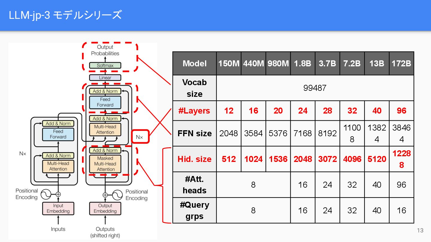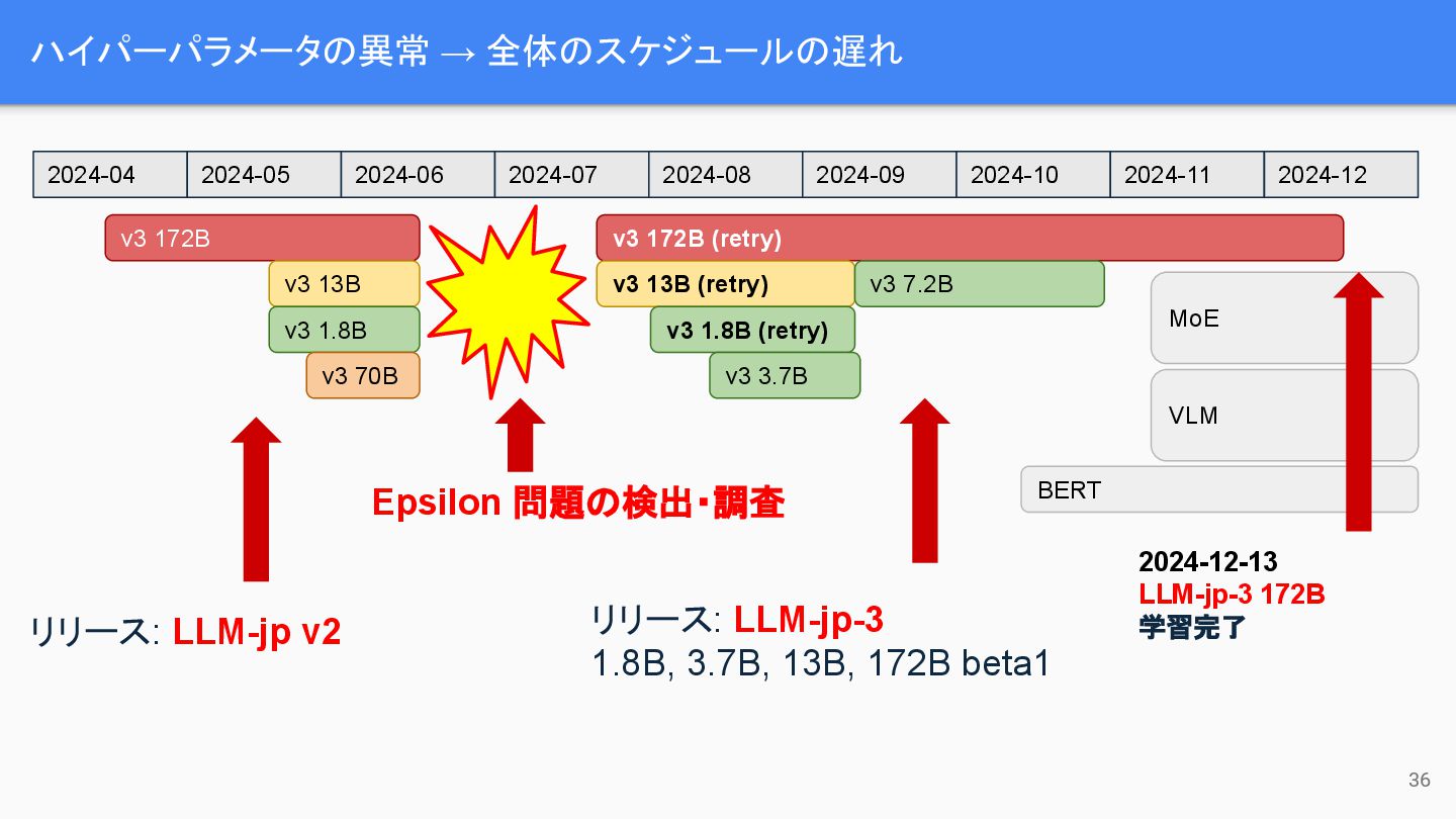 13B v3 1.8B v3 70B 2024-04 2024-05 2024-06 2024-07 2024-08 2024-09 2024-10 2024-11 2024-12 v3 172B (retry) v3 13B (retry) v3 1.8B (retry) v3 3.7B v3 7.2B リリース: LLM-jp-3 1.8B, 3.7B, 13B, 172B beta1 BERT MoE VLM 2024-12-13 LLM-jp-3 172B 学習完了 Epsilon 問題の検出・調査