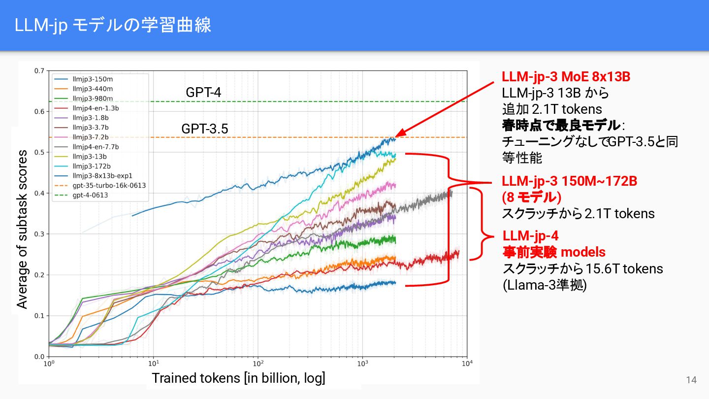 tokens 春時点で最良モデル: チューニングなしでGPT-3.5と同 等性能 LLM-jp-3 150M~172B (8 モデル) スクラッチから 2.1T tokens LLM-jp-4 事前実験 models スクラッチから 15.6T tokens (Llama-3準拠) GPT-3.5 GPT-4 Trained tokens [in billion, log] Average of subtask scores 14