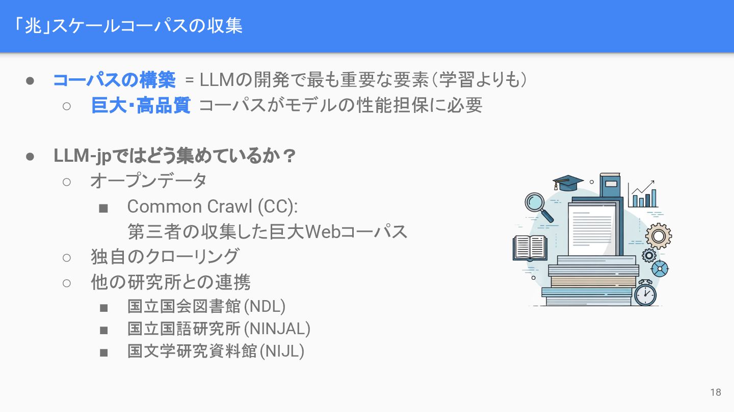 LLM-jpではどう集めているか? ◦ オープンデータ ▪ Common Crawl (CC): 第三者の収集した巨大Webコーパス ◦ 独自のクローリング ◦ 他の研究所との連携 ▪ 国立国会図書館 (NDL) ▪ 国立国語研究所 (NINJAL) ▪ 国文学研究資料館 (NIJL)