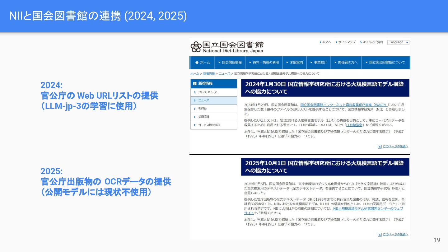 NIIと国会図書館の連携 (2024, 2025) 19 2024: 官公庁の Web URLリストの提供 (LLM-jp-3の学習に使用) 2025: