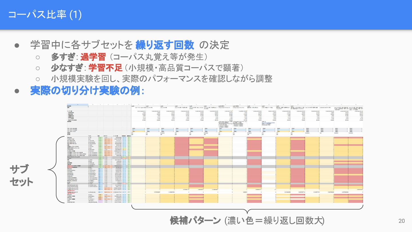 (コーパス丸覚え等が発生) ◦ 少なすぎ: 学習不足(小規模・高品質コーパスで顕著) ◦ 小規模実験を回し、実際のパフォーマンスを確認しながら調整 • 実際の切り分け実験の例: サブ セット 候補パターン (濃い色=繰り返し回数大)