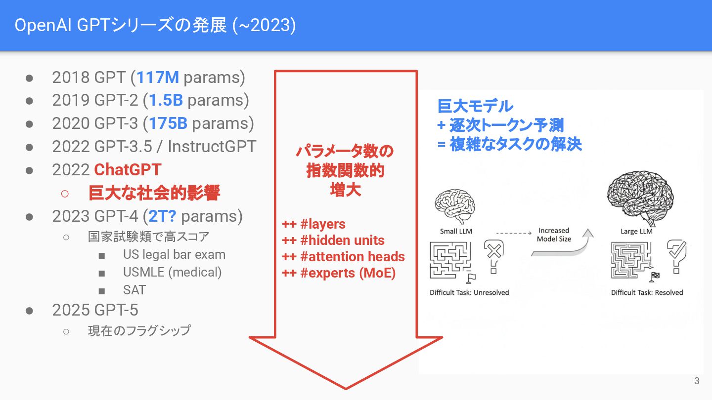 GPT-2 (1.5B params) • 2020 GPT-3 (175B params) • 2022 GPT-3.5 / InstructGPT • 2022 ChatGPT ◦ 巨大な社会的影響 • 2023 GPT-4 (2T? params) ◦ 国家試験類で高スコア ▪ US legal bar exam ▪ USMLE (medical) ▪ SAT • 2025 GPT-5 ◦ 現在のフラグシップ パラメータ数の 指数関数的 増大 ++ #layers ++ #hidden units ++ #attention heads ++ #experts (MoE) 巨大モデル + 逐次トークン予測 = 複雑なタスクの解決 3