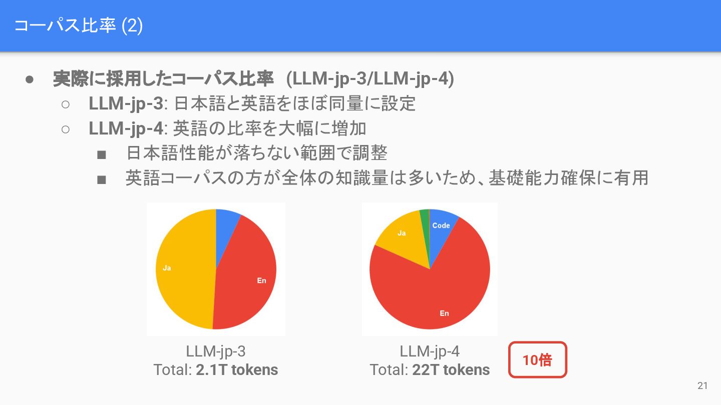 コーパス比率 (2) 21 LLM-jp-3 Total: 2.1T tokens LLM-jp-4 Total: 22T