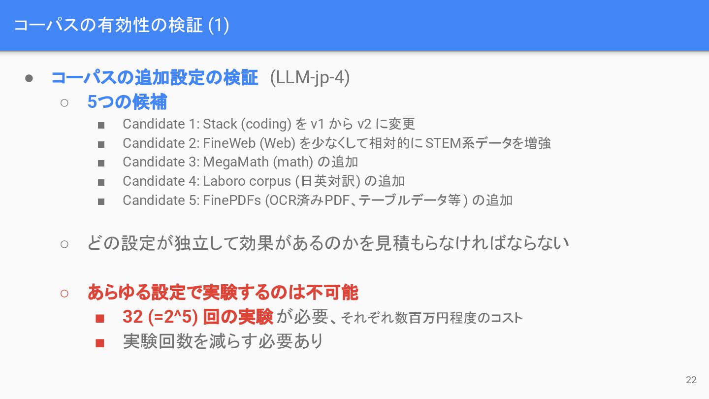 1: Stack (coding) を v1 から v2 に変更 ▪ Candidate 2: FineWeb (Web) を少なくして相対的に STEM系データを増強 ▪ Candidate 3: MegaMath (math) の追加 ▪ Candidate 4: Laboro corpus (日英対訳) の追加 ▪ Candidate 5: FinePDFs (OCR済みPDF、テーブルデータ等) の追加 ◦ どの設定が独立して効果があるのかを見積もらなければならない ◦ あらゆる設定で実験するのは不可能 ▪ 32 (=2^5) 回の実験が必要、それぞれ数百万円程度のコスト ▪ 実験回数を減らす必要あり
