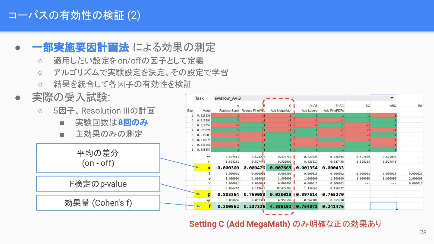 コーパスの有効性の検証 (2) 23 • 一部実施要因計画法 による効果の測定 ◦ 適用したい設定をon/offの因子として定義 ◦ アルゴリズムで実験設定を決定、その設定で学習
