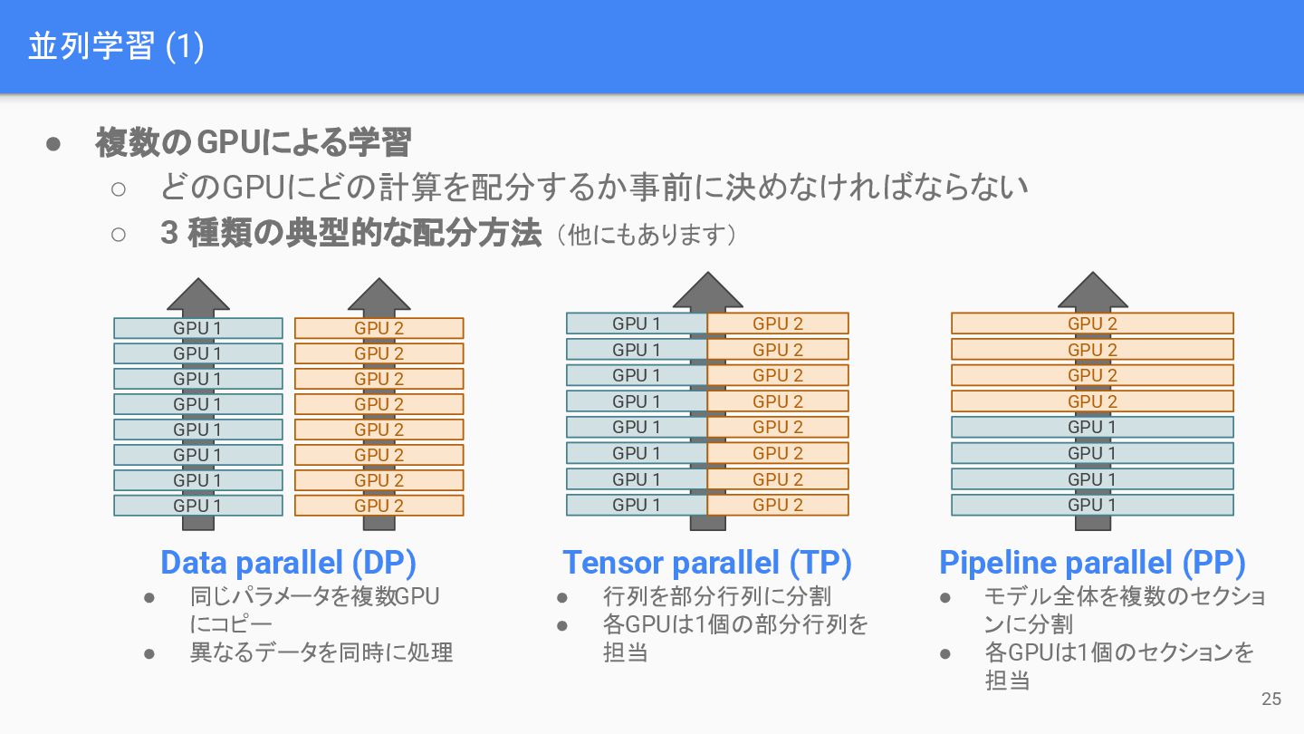(他にもあります) GPU 1 GPU 1 GPU 1 GPU 1 GPU 1 GPU 1 GPU 1 GPU 1 GPU 2 GPU 2 GPU 2 GPU 2 GPU 2 GPU 2 GPU 2 GPU 2 GPU 1 GPU 1 GPU 1 GPU 1 GPU 1 GPU 1 GPU 1 GPU 1 GPU 2 GPU 2 GPU 2 GPU 2 GPU 2 GPU 2 GPU 2 GPU 2 GPU 2 GPU 2 GPU 2 GPU 2 GPU 1 GPU 1 GPU 1 GPU 1 Data parallel (DP) • 同じパラメータを複数GPU にコピー • 異なるデータを同時に処理 Tensor parallel (TP) • 行列を部分行列に分割 • 各GPUは1個の部分行列を 担当 Pipeline parallel (PP) • モデル全体を複数のセクショ ンに分割 • 各GPUは1個のセクションを 担当
