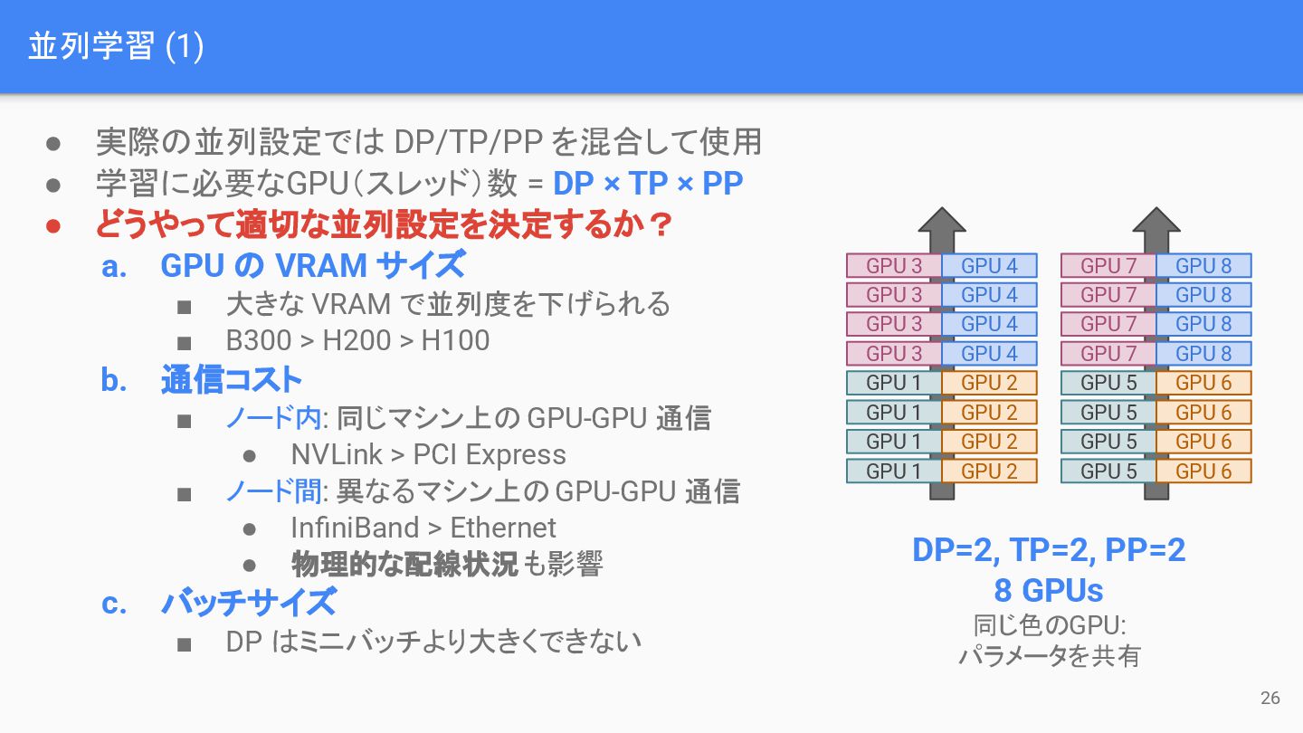 DP × TP × PP • どうやって適切な並列設定を決定するか? a. GPU の VRAM サイズ ▪ 大きな VRAM で並列度を下げられる ▪ B300 > H200 > H100 b. 通信コスト ▪ ノード内: 同じマシン上の GPU-GPU 通信 • NVLink > PCI Express ▪ ノード間: 異なるマシン上の GPU-GPU 通信 • InfiniBand > Ethernet • 物理的な配線状況も影響 c. バッチサイズ ▪ DP はミニバッチより大きくできない GPU 3 GPU 3 GPU 3 GPU 3 GPU 1 GPU 1 GPU 1 GPU 1 GPU 4 GPU 4 GPU 4 GPU 4 GPU 2 GPU 2 GPU 2 GPU 2 GPU 7 GPU 7 GPU 7 GPU 7 GPU 5 GPU 5 GPU 5 GPU 5 GPU 8 GPU 8 GPU 8 GPU 8 GPU 6 GPU 6 GPU 6 GPU 6 DP=2, TP=2, PP=2 8 GPUs 同じ色のGPU: パラメータを共有