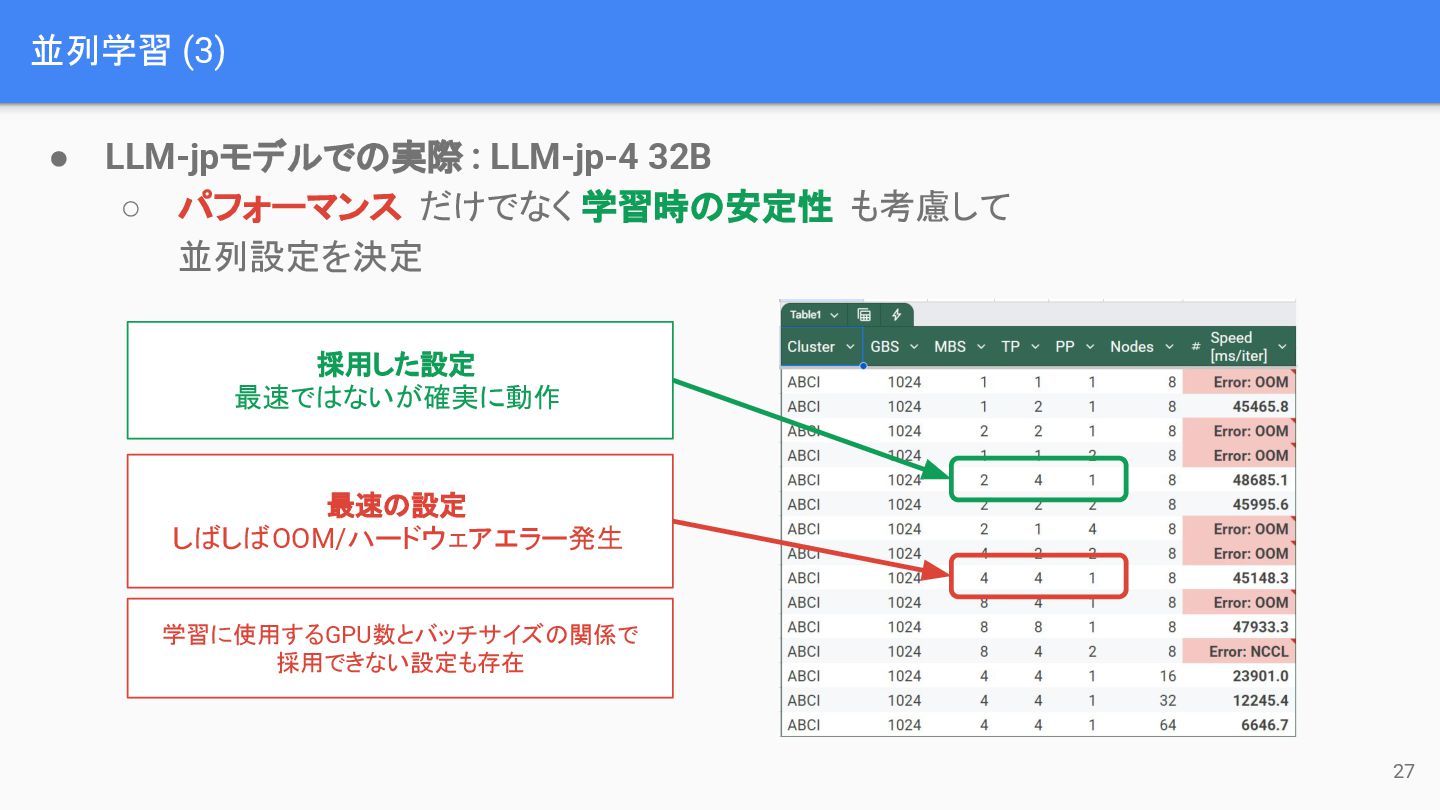 だけでなく 学習時の安定性 も考慮して 並列設定を決定 採用した設定 最速ではないが確実に動作 最速の設定 しばしばOOM/ハードウェアエラー発生 学習に使用するGPU数とバッチサイズの関係で 採用できない設定も存在