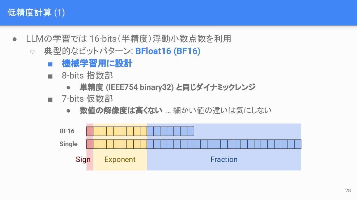 低精度計算 (1) 28 • LLMの学習では 16-bits(半精度)浮動小数点数を利用 ◦ 典型的なビットパターン: BFloat16 (BF16)
