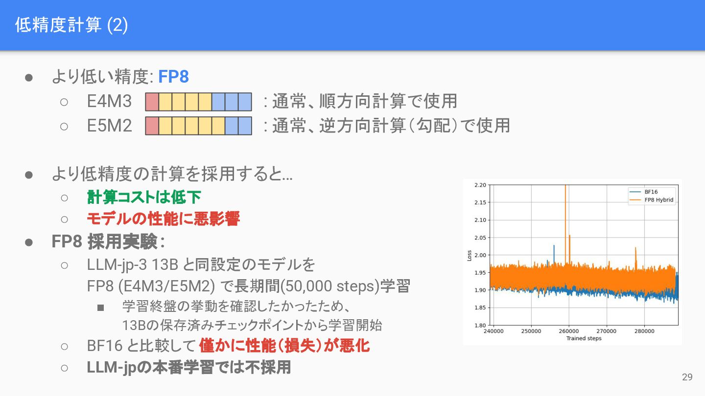 ◦ E5M2 : 通常、逆方向計算(勾配)で使用 • より低精度の計算を採用すると… ◦ 計算コストは低下 ◦ モデルの性能に悪影響 • FP8 採用実験: ◦ LLM-jp-3 13B と同設定のモデルを FP8 (E4M3/E5M2) で長期間(50,000 steps)学習 ▪ 学習終盤の挙動を確認したかったため、 13Bの保存済みチェックポイントから学習開始 ◦ BF16 と比較して 僅かに性能(損失)が悪化 ◦ LLM-jpの本番学習では不採用