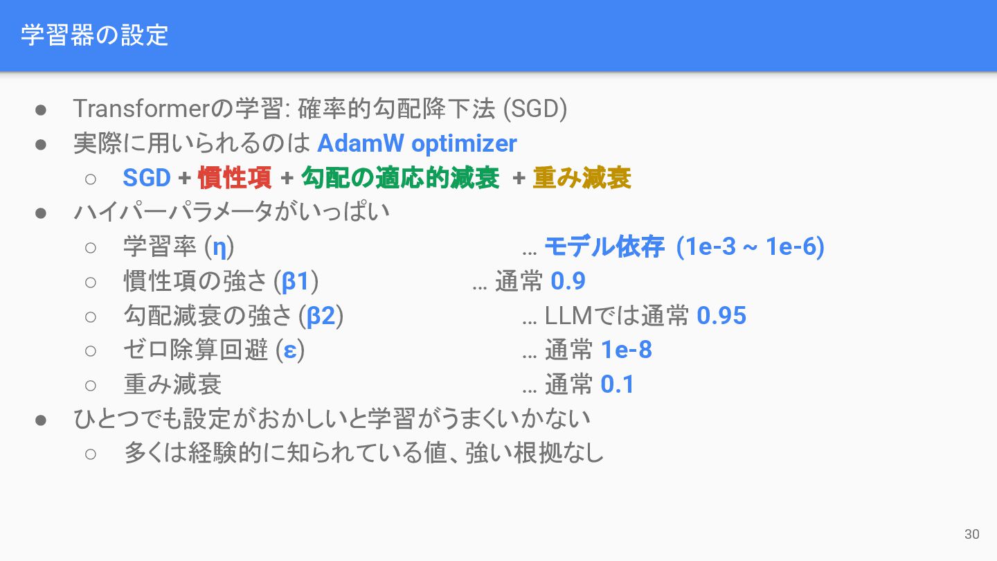 ◦ SGD + 慣性項 + 勾配の適応的減衰 + 重み減衰 • ハイパーパラメータがいっぱい ◦ 学習率 (η) … モデル依存 (1e-3 ~ 1e-6) ◦ 慣性項の強さ (β1) … 通常 0.9 ◦ 勾配減衰の強さ (β2) … LLMでは通常 0.95 ◦ ゼロ除算回避 (ε) … 通常 1e-8 ◦ 重み減衰 … 通常 0.1 • ひとつでも設定がおかしいと学習がうまくいかない ◦ 多くは経験的に知られている値、強い根拠なし