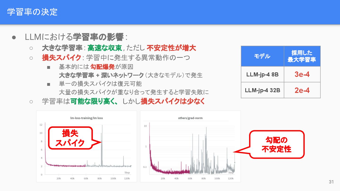 大きな学習率 : 高速な収束 , ただし 不安定性が増大 ◦ 損失スパイク : 学習中に発生する異常動作の一つ ▪ 基本的には 勾配爆発が原因 大きな学習率 + 深いネットワーク(大きなモデル)で発生 ▪ 単一の損失スパイクは復元可能 大量の損失スパイクが重なり合って発生すると学習失敗に ◦ 学習率は可能な限り高く、 しかし損失スパイクは少なく モデル 採用した 最大学習率 LLM-jp-4 8B 3e-4 LLM-jp-4 32B 2e-4