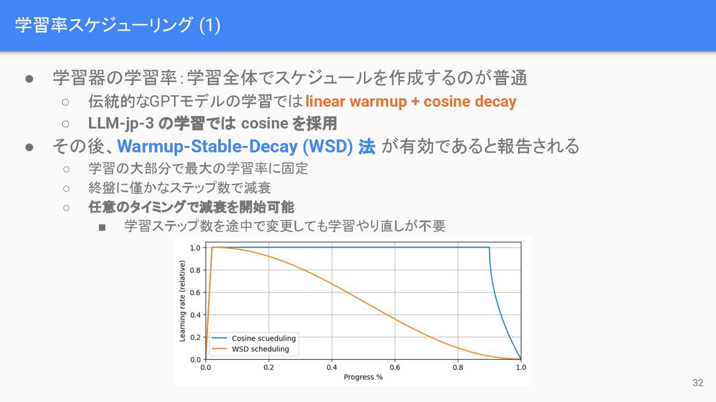 学習率の決定 31 損失 スパイク 勾配の 不安定性 • LLMにおける学習率の影響 : ◦
