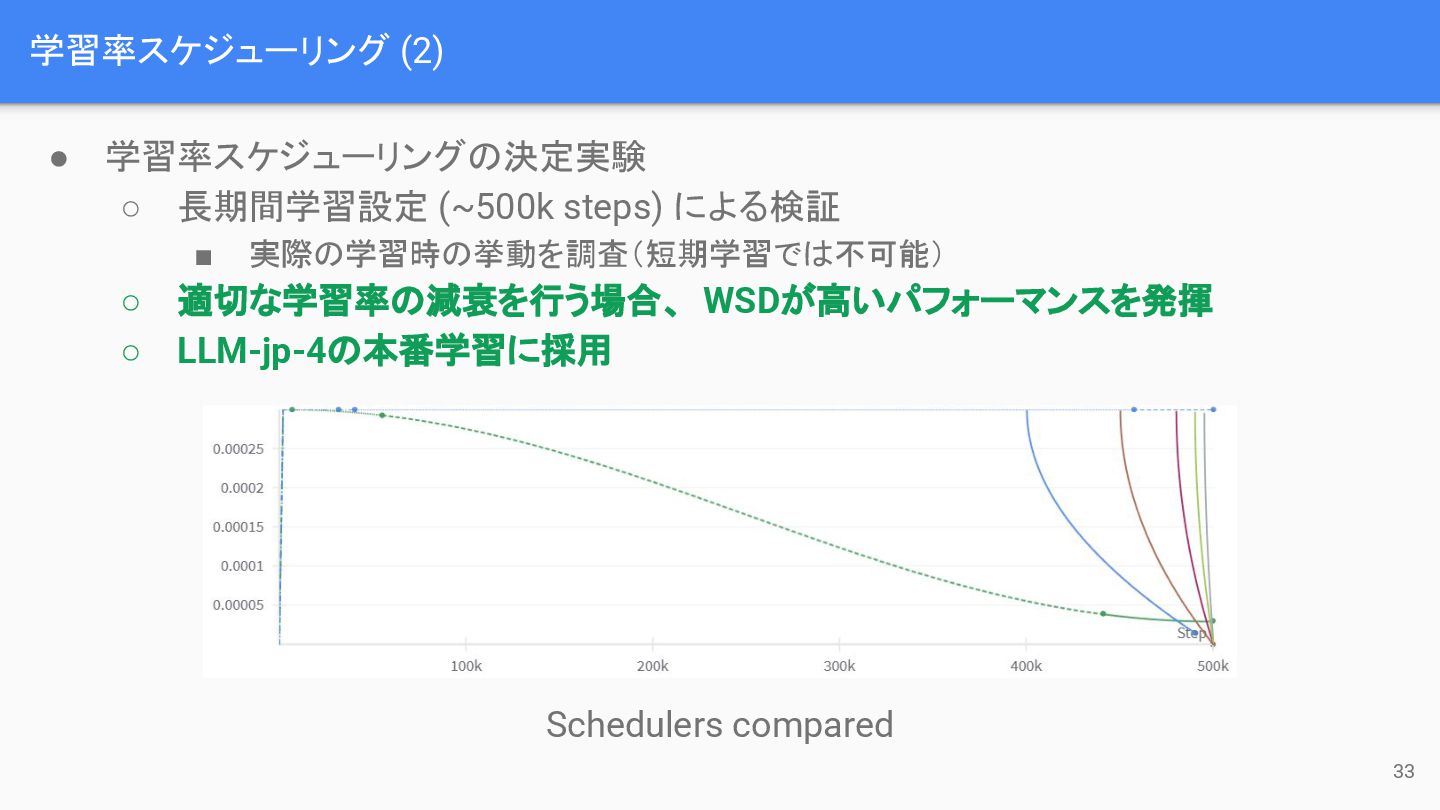 ▪ 実際の学習時の挙動を調査(短期学習では不可能) ◦ 適切な学習率の減衰を行う場合、 WSDが高いパフォーマンスを発揮 ◦ LLM-jp-4の本番学習に採用 Schedulers compared